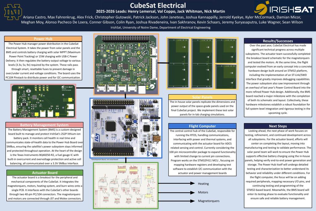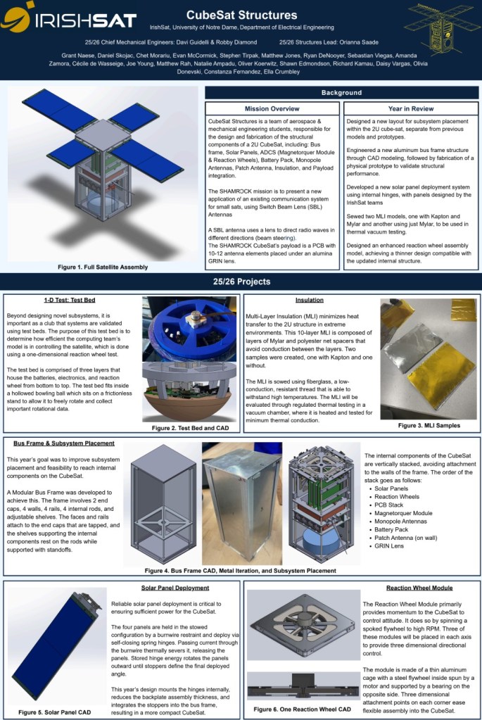 The IrishSat CubeSat team’s mission is to apply for, design, develop and launch a CubeSat through NASA’s CubeSat Launch Initiative. This satellite will hold a Notre Dame professor’s research project onboard which will advance NASA’s research towards their critical objectives.