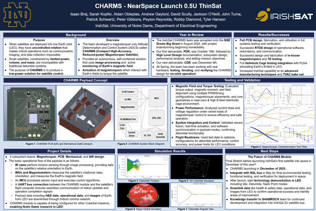 IrishSat is officially headed to orbit. In Spring 2026, aboard the SpaceX Transporter-16 Mission, IrishSat will launch its first-ever satellite payload: CHARMS (Compact High-Accuracy, Reduced-power Magnetorquer Satellite). This milestone marks the first time an IrishSat-built system will operate in Low Earth Orbit, marking a major milestone that is the culmination of years of design, testing, and student-driven engineering.